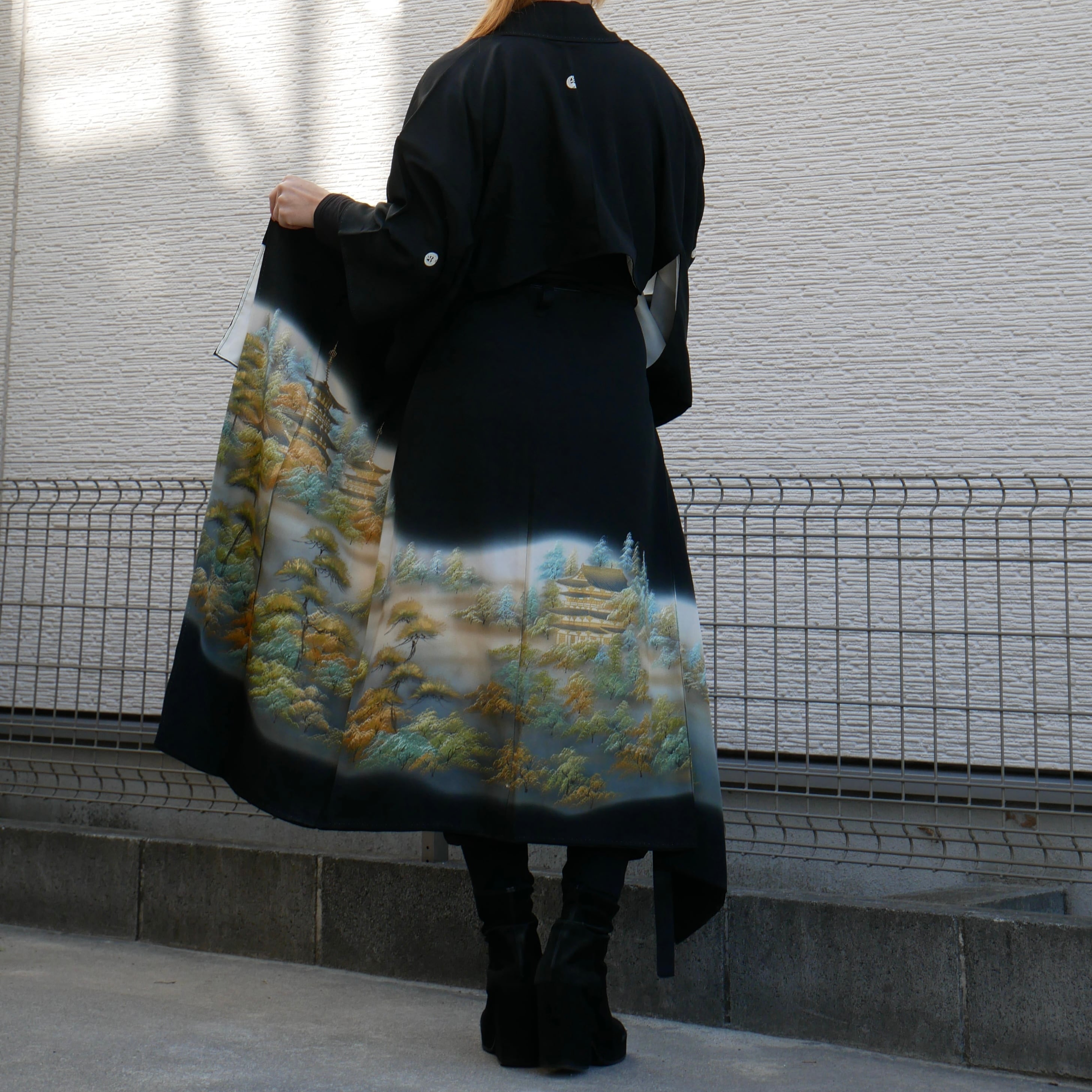 漆黒の生地に、五重塔が描かれたスカートが印象的な着物セットアップ。