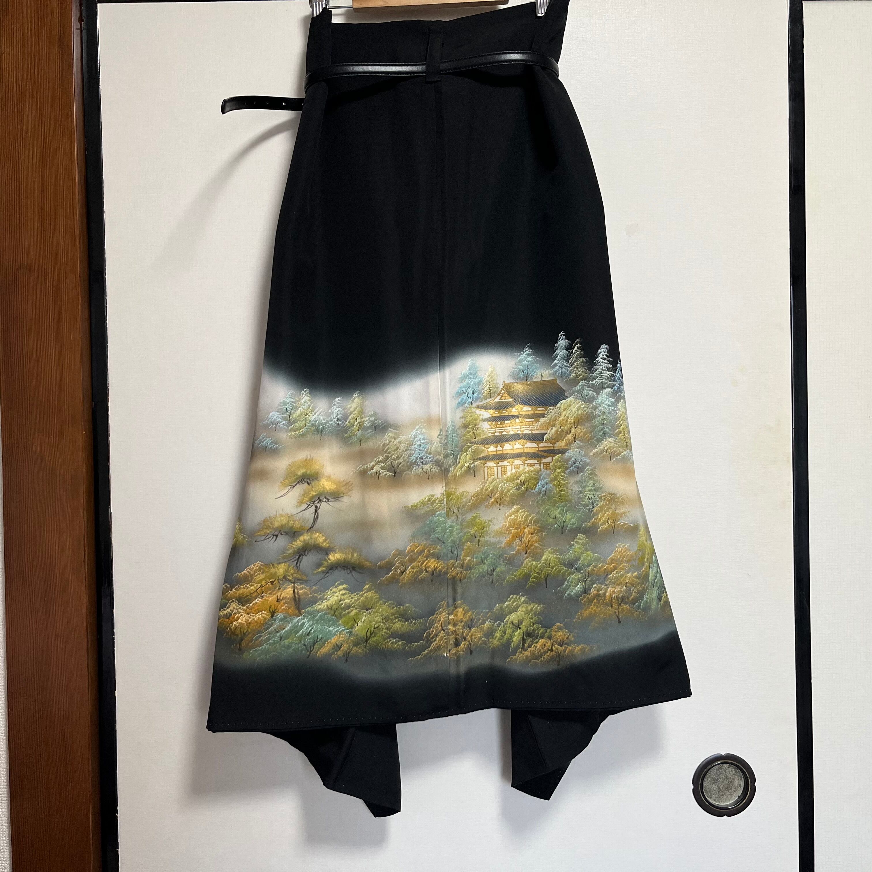 A kimono setup featuring a striking skirt adorned with an illustration of a five-story pagoda.