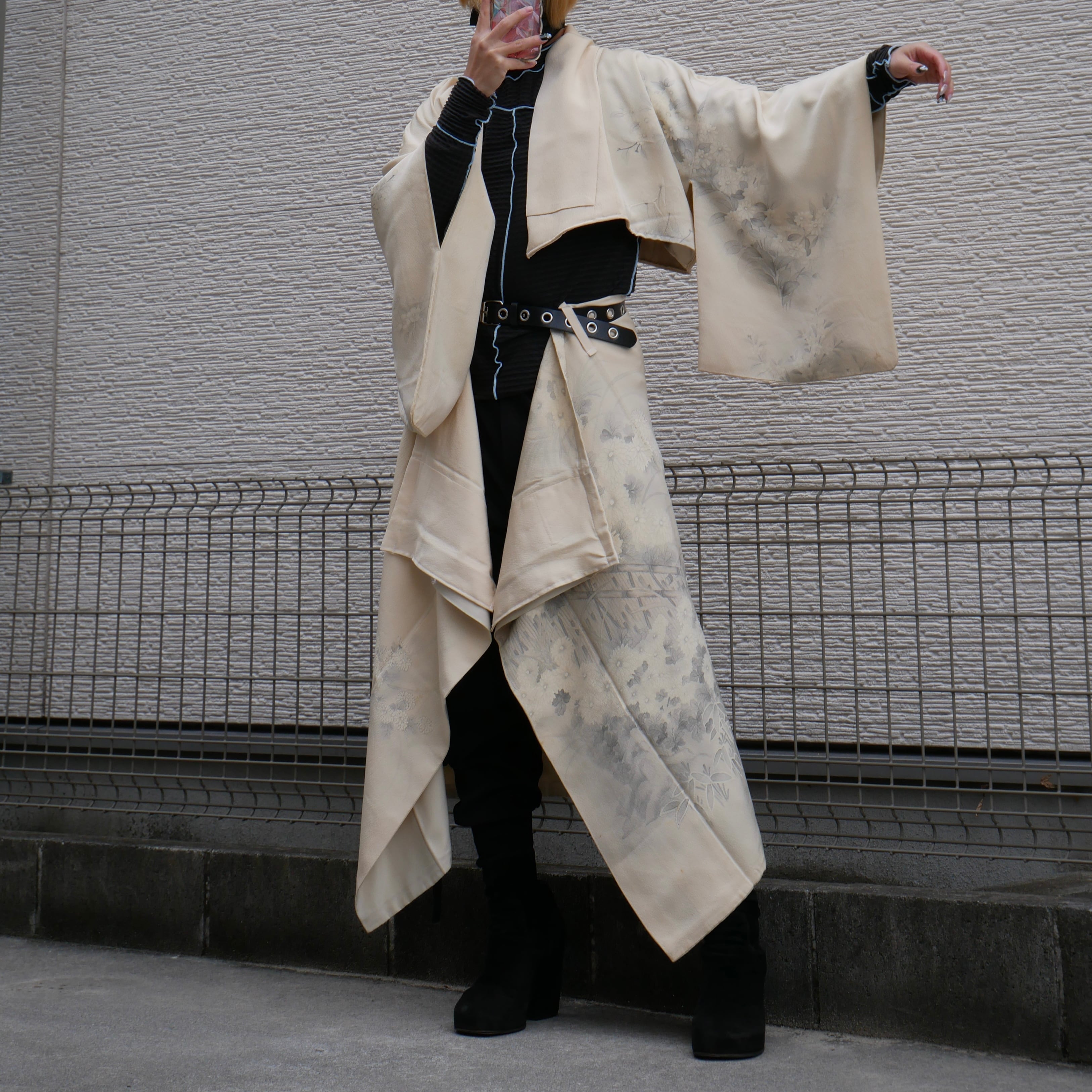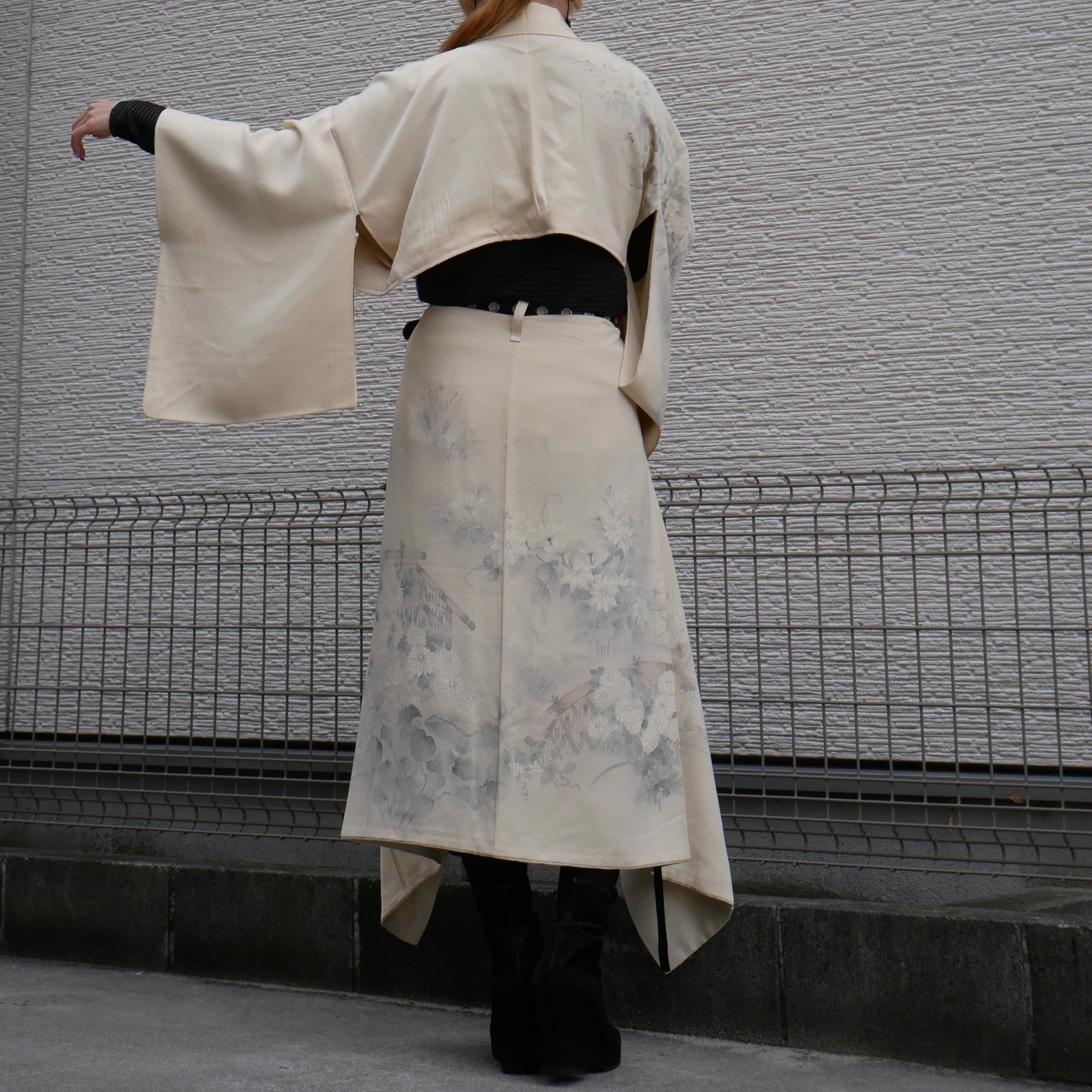 A one-of-a-kind kimono set-up in a soft ivory tone,