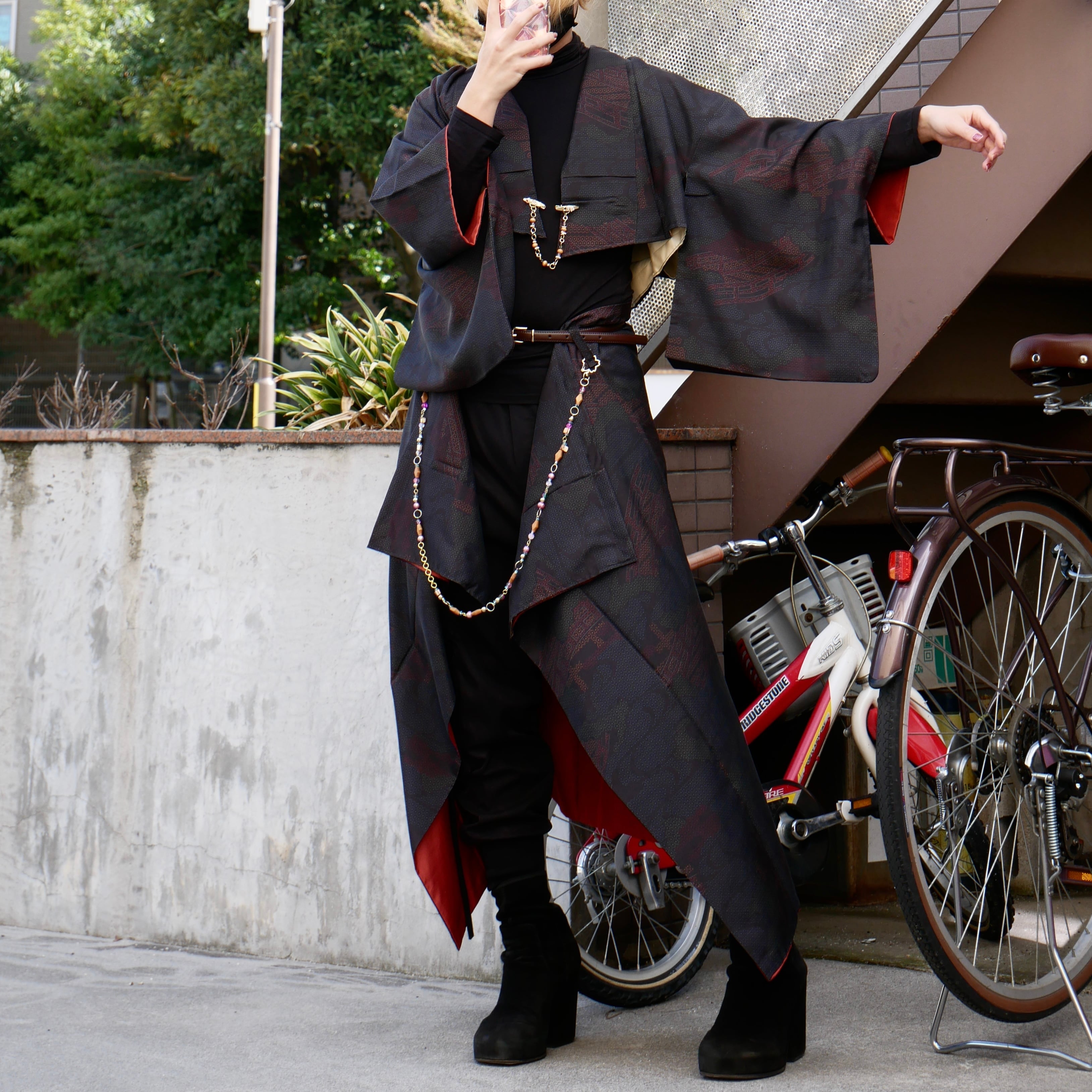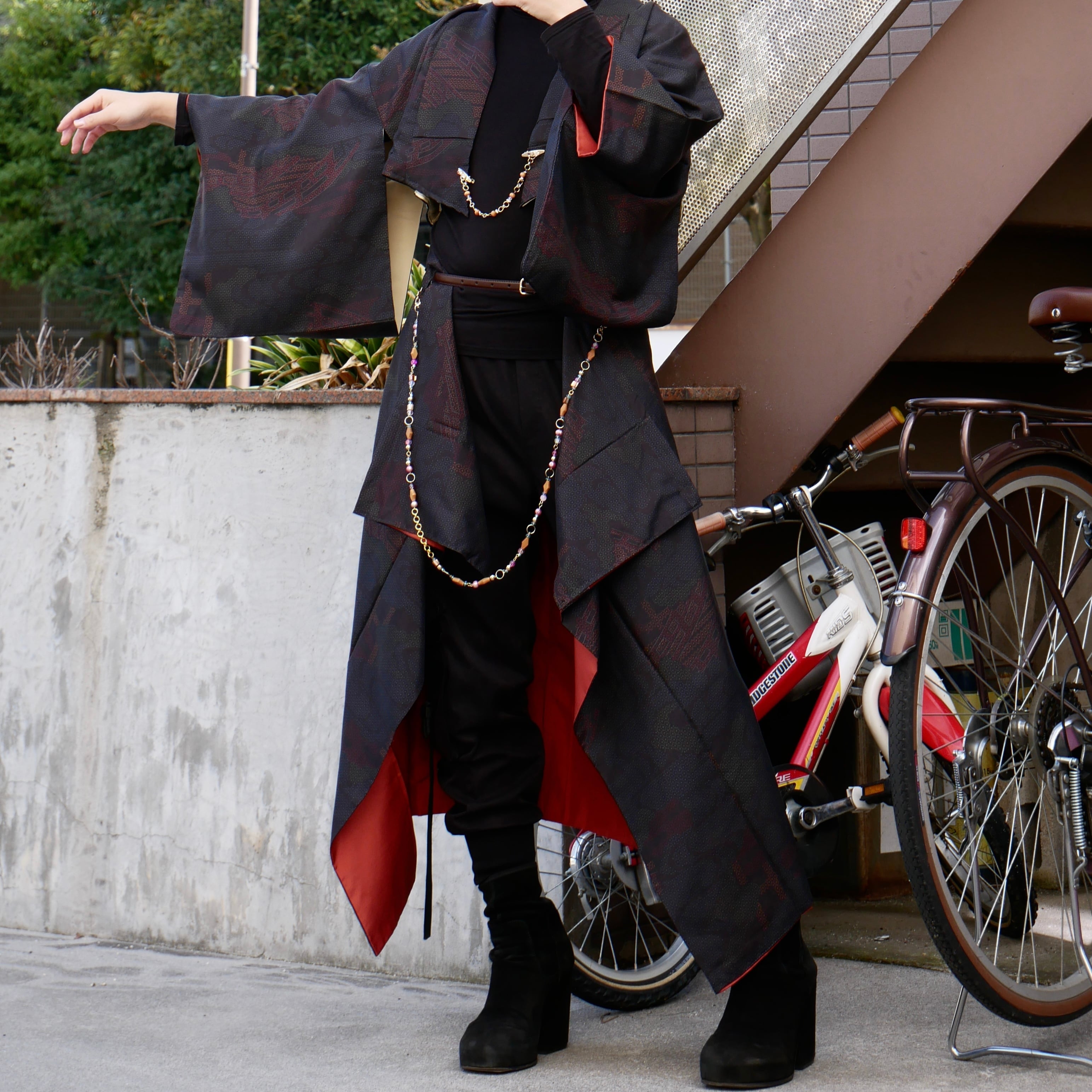 深みのある黒をベースに、さりげなく浮かび上がる赤の文様が印象的な着物セットアップ。