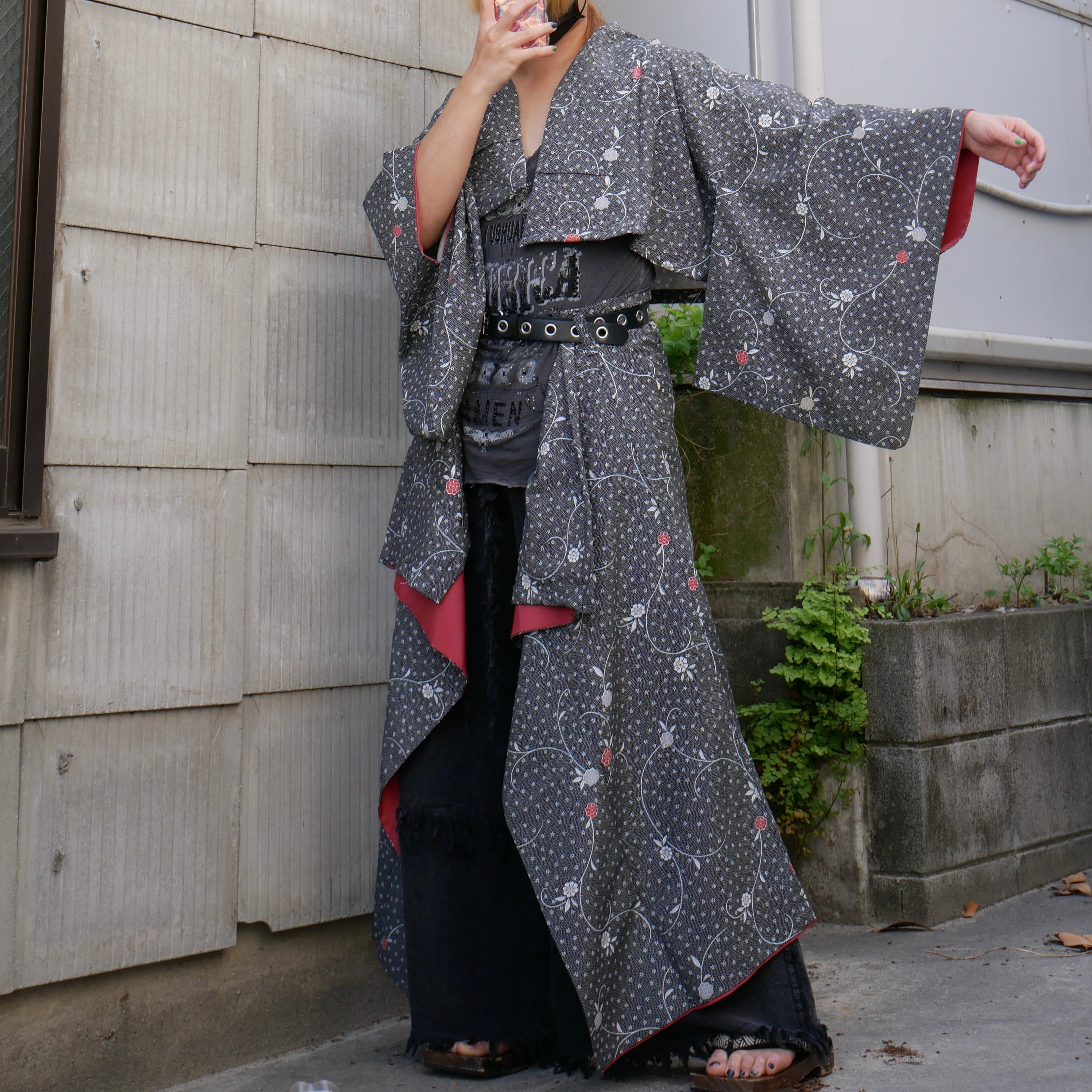 A reconstructed setup made from vintage Japanese kimono, featuring a black base with delicate red and white floral patterns.