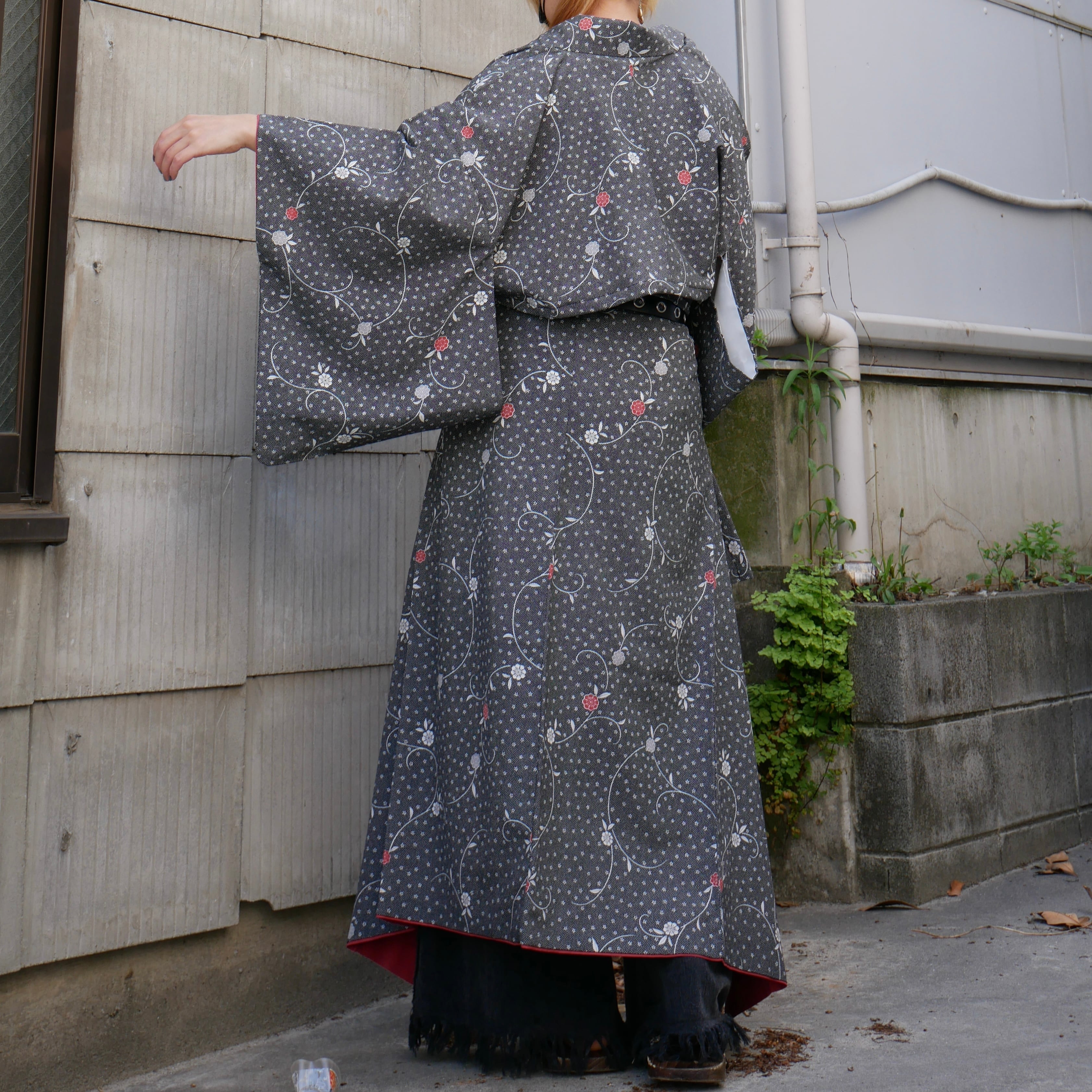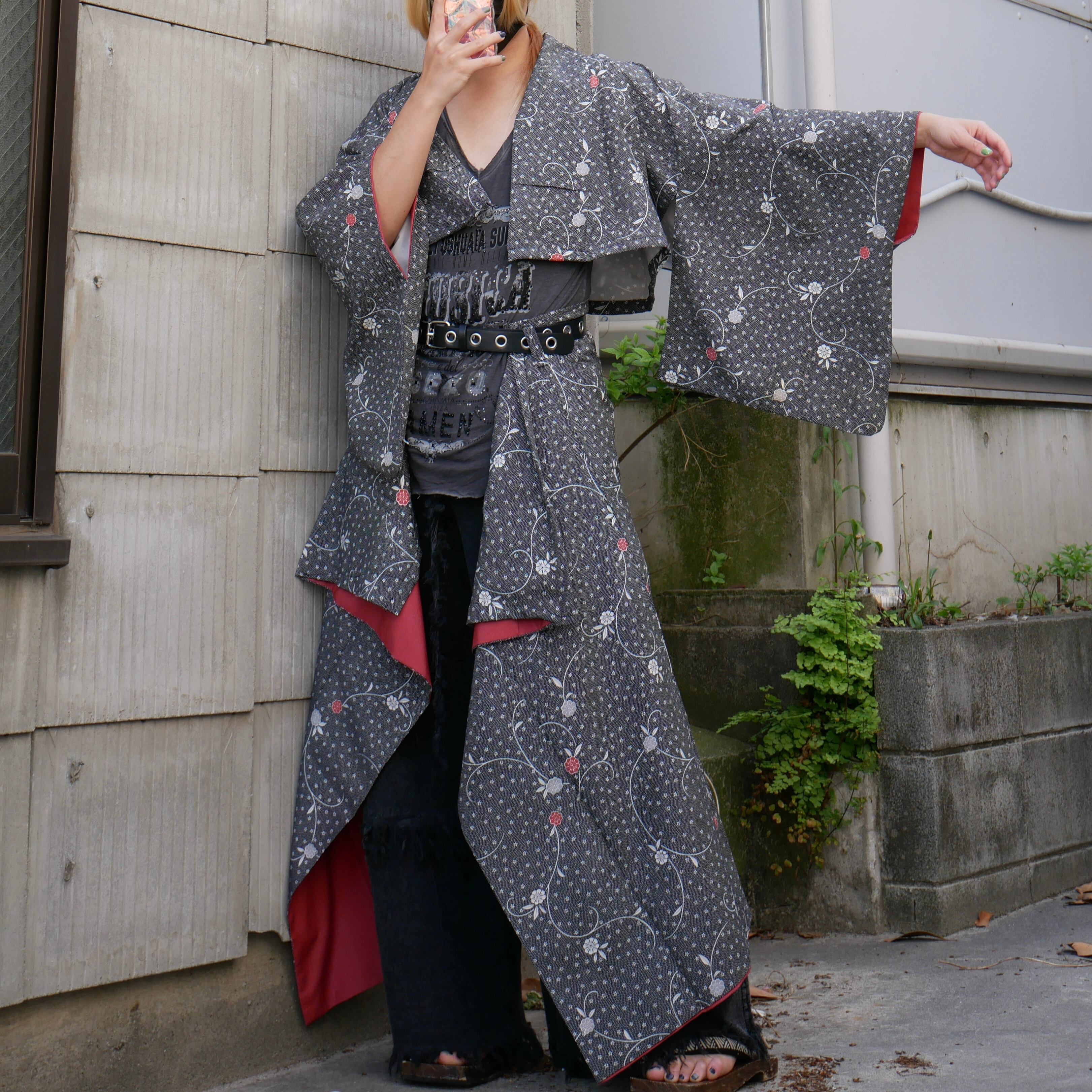 黒地に繊細な白と赤の花柄が広がる、ヴィンテージ着物を再構築したセットアップ。