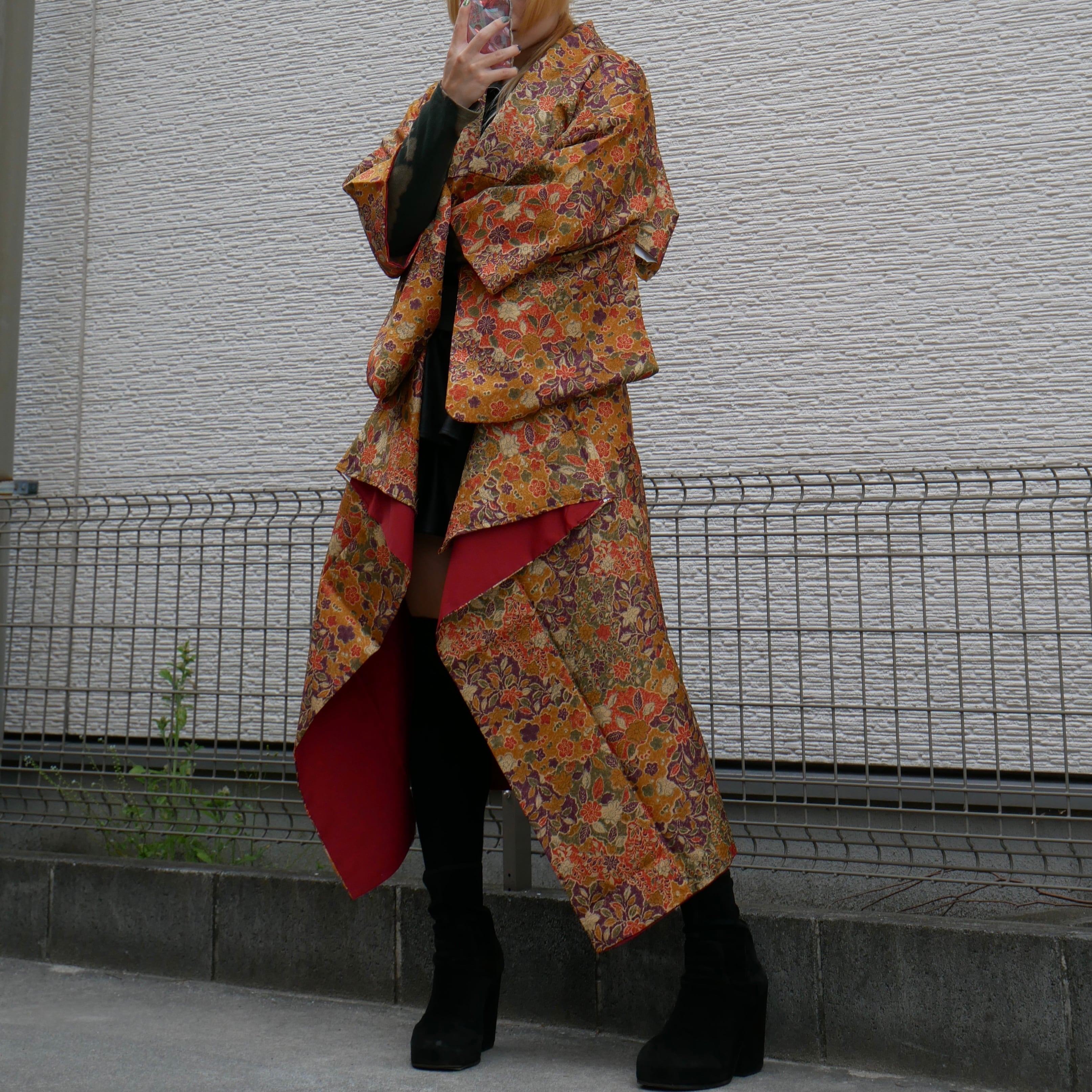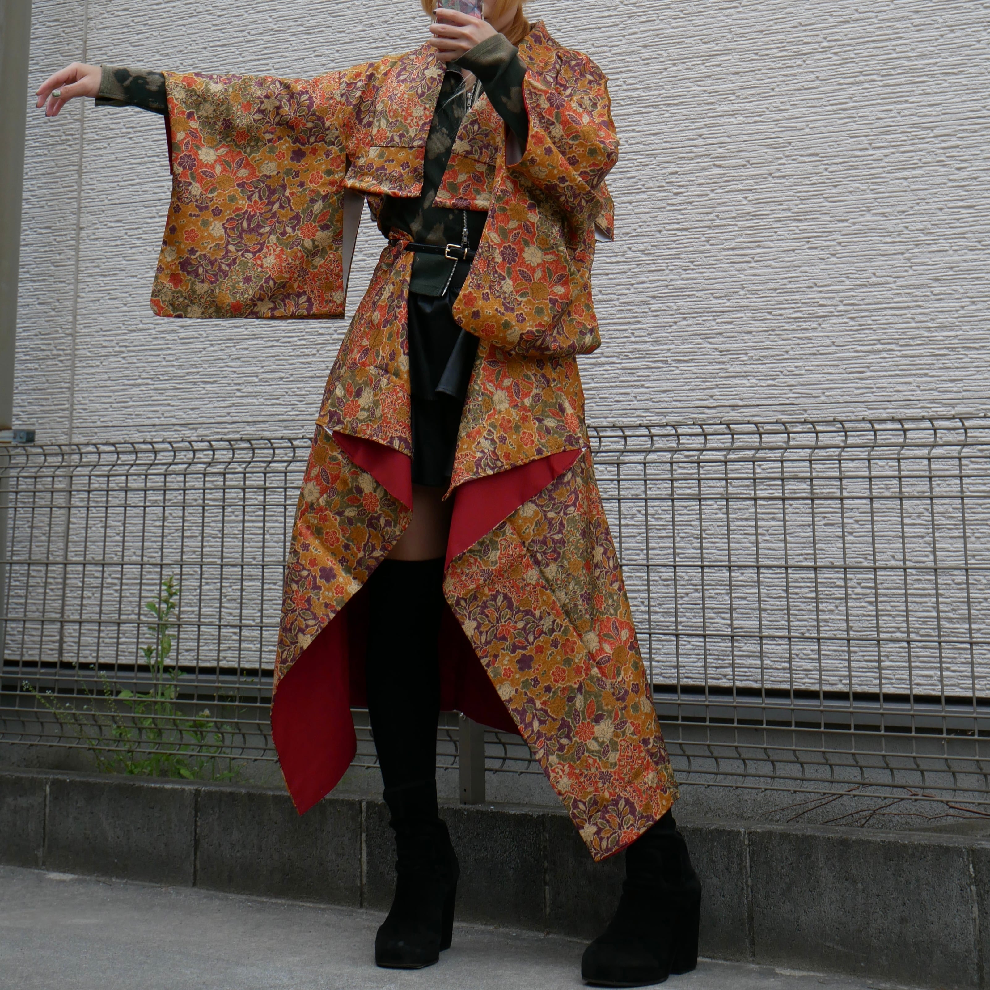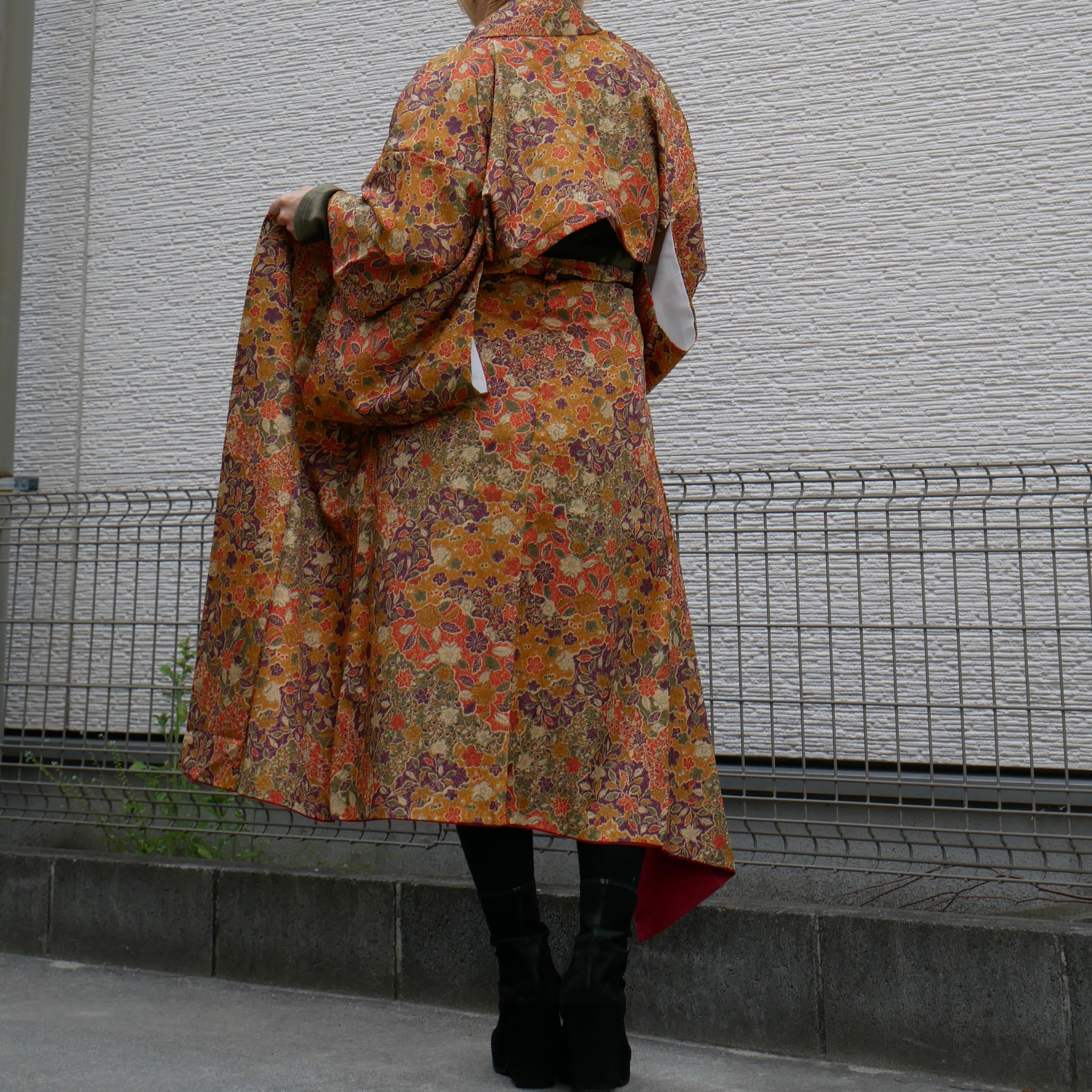 深みのある金茶をベースに、朱赤、紫、橙、生成りの花模様が華やかに広がる着物リメイクセットアップ。重厚感のある色彩と繊細な和柄が重なり合い、存在感あふれる一着に仕上げました。