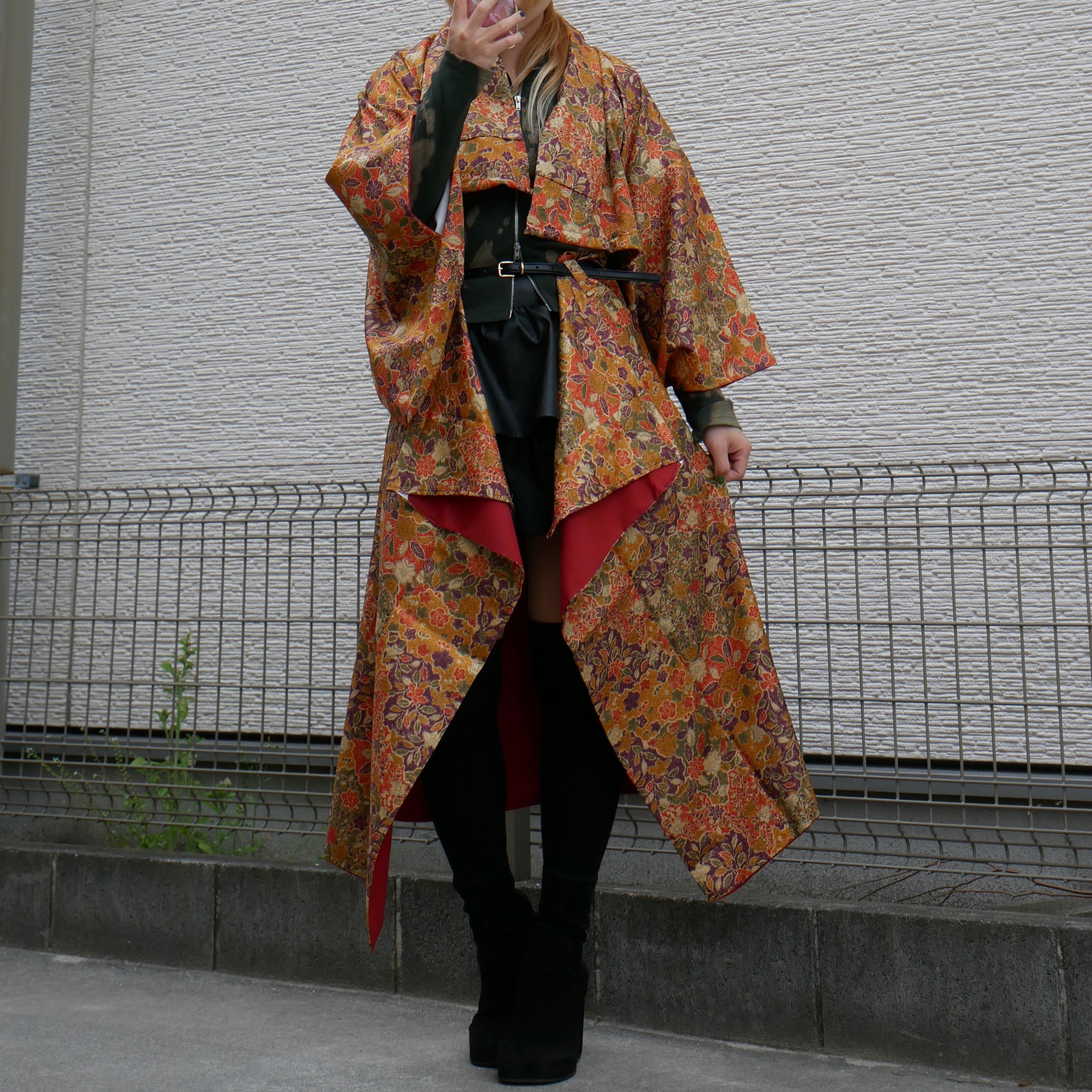 A reconstructed kimono set-up featuring a rich golden-brown base adorned with vibrant floral patterns in crimson, purple, orange, and ivory. The layered colors and intricate traditional motifs create a bold one-of-a-kind presence.